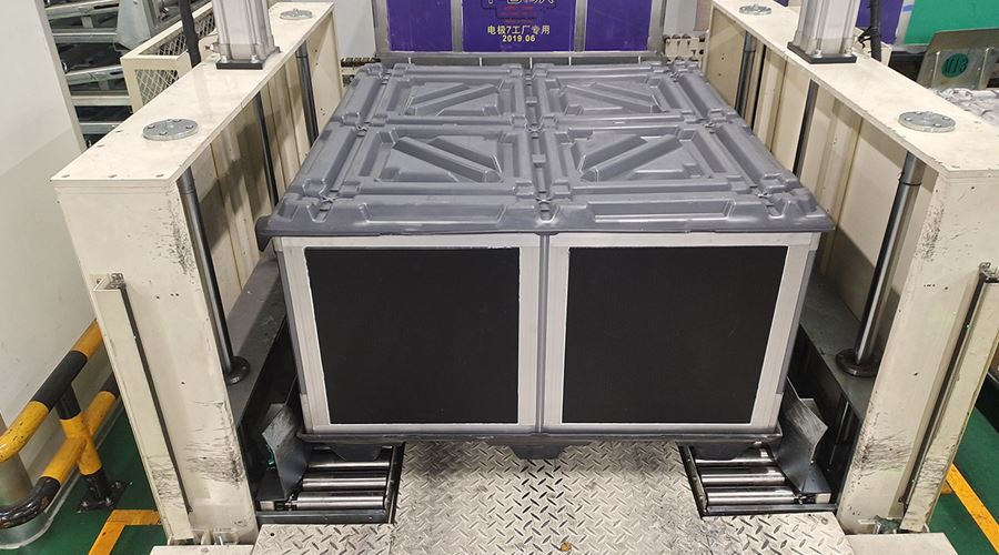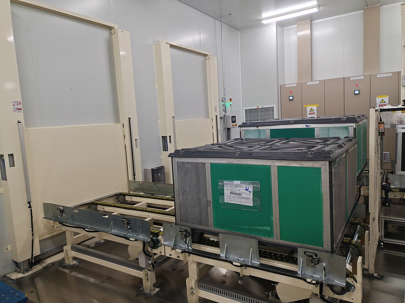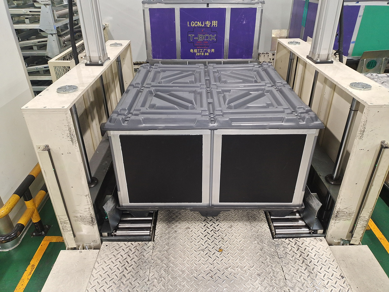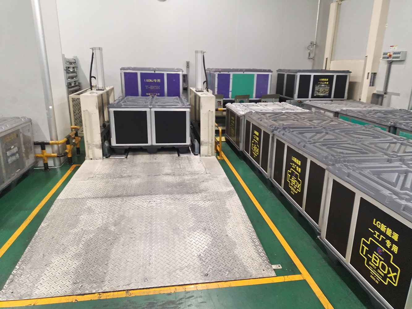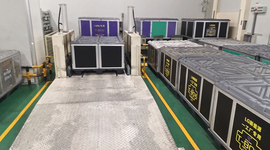 The system sends empty T-BOX to different indoor packaging areas, and after packaging, T-BOX is automatically packaged through logistics. The system includes a lifting logistics line, a rotating logistics line, an RGV rail car, a fork transplanting equipment, an indoor clean aerial crane system, an automatic packaging machine, a 360 degree rotating logistics line, and supporting safety protection equipment.