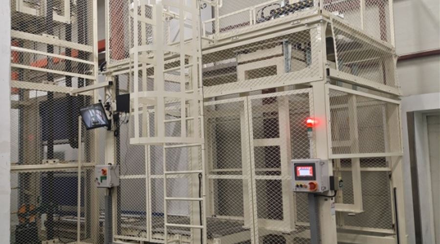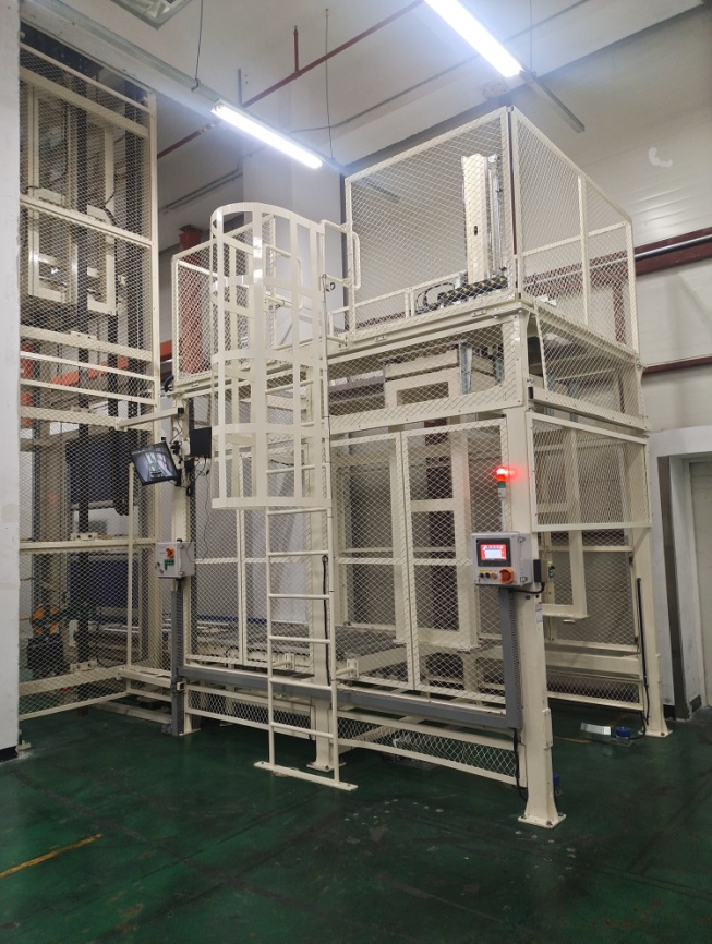 客户定制产品,将栈板连同货物由地面夹取提升后移送到物流线上或者将物流线上的货物夹取提升移栽到地面上,同时也可以实现可堆层的货物进行堆层,方便工人使用手动叉车叉取货物。